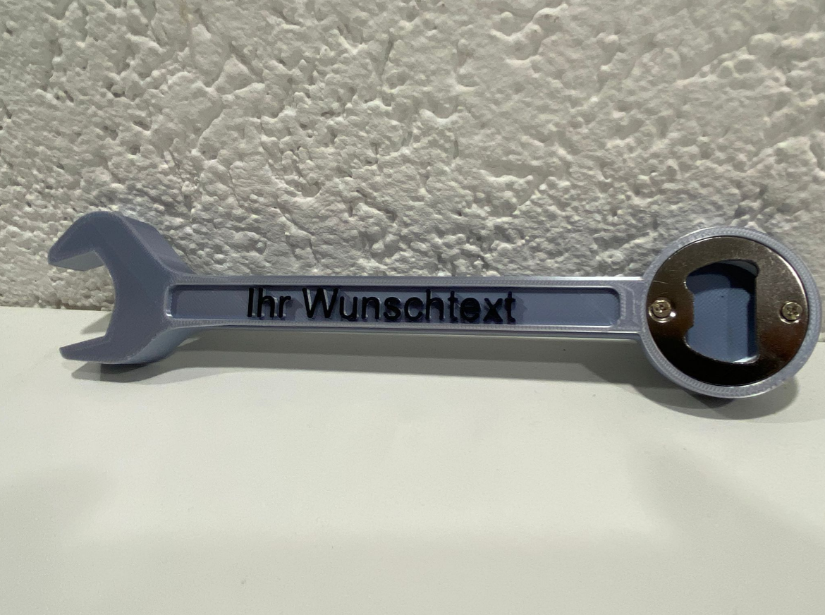 Flaschenöffner in Schraubenschlüssel Form mit Wunsch Text